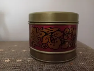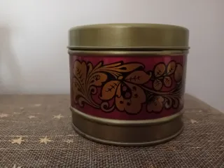 scatola in metallo con un design floreale. - Finitura esterna color bordeaux con decorazioni. - Coperchio e base in metallo color bronzo - Motivo floreale stilizzato. D.10cm ,alta 9cm.
