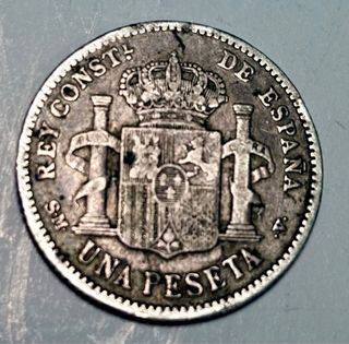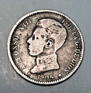 Moneta da una peseta del 1905, con l'effigie di Alfonso XIII. - Dritto: Alfonso XIII. - Rovescio: POR LA G. DE DIOS e anno 1905. - Bordo zigrinato.