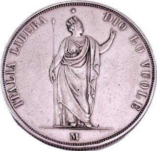 Moneta da 5 Lire del 1848, coniata a Milano. Raffigura la Libertà che regge uno stendardo. - Dritto: Italia Libera. - Rovescio: Dio lo vuole. - Zecca: Milano. - Anno: 1848.