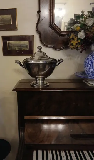 Elegante zuppiera d'epoca in alpacca argentata, risalente agli anni '50. Un pezzo per collezionisti. Medesimo modello della zuppiera realizzata dai Fratelli Calderoni su progetto di Gio' Ponti ( vedi ultima foto posta solo come confronto). - Materiale: Alpacca argentata - Periodo: Anni '50 - Design: Classico con manici e coperchio - Finitura: Argentata lucida