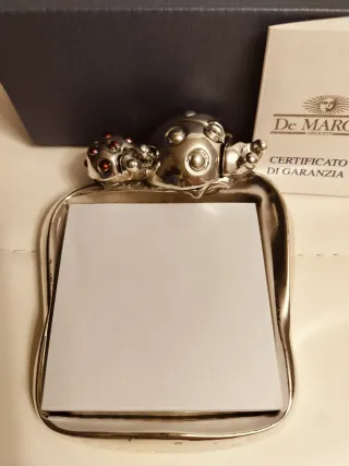 Grazioso porta post-it in argento, modellato a forma di coccinella con dettagli rossi. - Design a forma di coccinella. - Finitura in argento lucido. - Dettagli decorativi rossi.