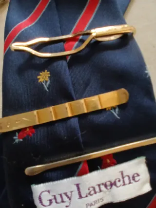 Set di tre fermacravatta d'epoca risalenti agli anni '50. Questi accessori aggiungono un tocco di stile classico. Metallo dorato. Normali segni del tempo. - Fermacravatta dorato con motivo mazza da golf vintage. - Fermacravatta dorato con texture a righe. - Fermacravatta dorato con dettaglio a ferro di cavallo e chiodo da maniscalco.
