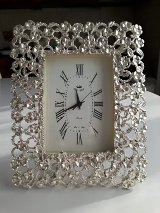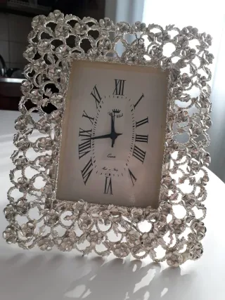 Elegante orologio da tavolo con una cornice decorata con motivi floreali. - Cornice in metallo finemente lavorata. - Quadrante con numeri romani. - Design italiano.