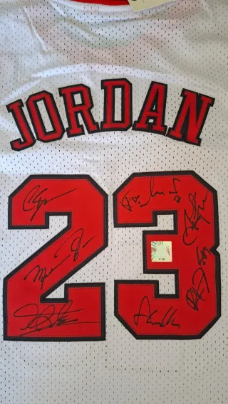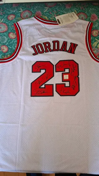 Maglia Bulls Micheal Jordan autografata Micheal Jordan Scottie Pippen Denis Rodman Tony Kukoc Ron Harper Steve Kerr Phil Jackson con certificato di autenticitá formato libro.
