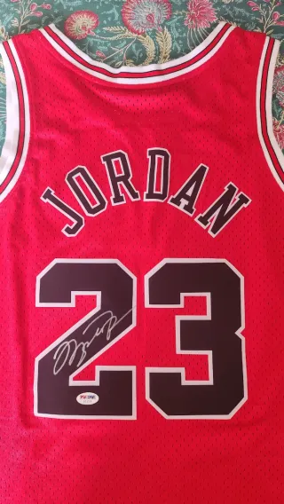 Maglia da basket autografata da Michael Jordan, numero 23. - Autografo verificato da PSA DNA. - Maglia rossa con nome JORDAN e numero 23 in nero.