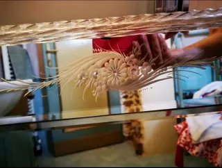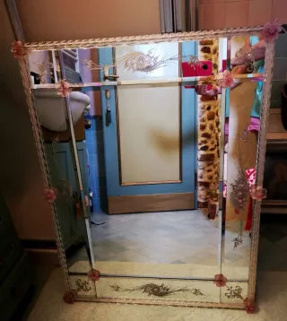 Elegante specchio in cristallo molato di Murano originale con decorazioni floreali. - Fiori applicati in vetro tono rosa /bianco - Incisioni floreali sul vetro con colata in argento. Conserva dietro la cimasa in legno con catenone da appendere. Misura cm 92 di altezza x 72 di larghezza. Preferibile consegna a mano zona Treviso.