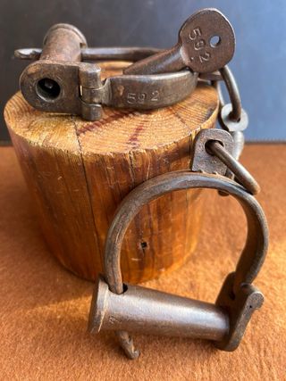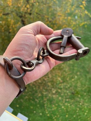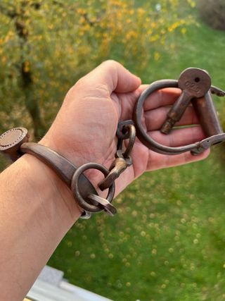 Antiche manette in ferro battuto, complete di chiave, perfettamente funzionanti. - Materiale: Ferro battuto. - Numerazione: 94 sul bracciale e sulla chiave. - Design: Manette con catena e anelli.
