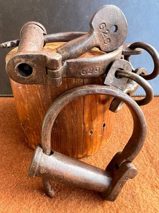 Manette antiche in ferro battuto con numerate, complete delle proprie chiavi. - Materiale: Ferro battuto - Dettaglio: Numero inciso sia sul bracciale sia sulla chiave. Perfettamente funzionanti.