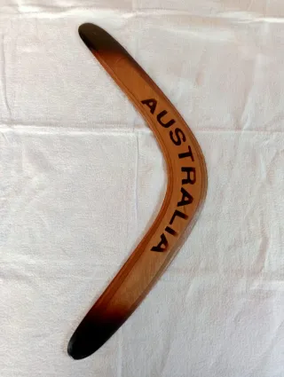 Bumerang in legno con la scritta Australia incisa. Lunga 44 cm, larga 5 cm. - Materiale: Legno - Design: Bumerang - Decorazione: Scritta Australia