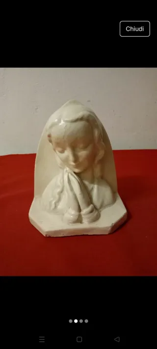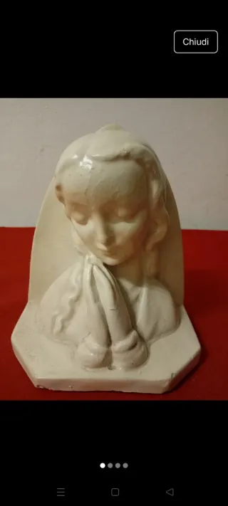 Delicata scultura artigianale della Madonna in gesso. Alta 16 cm, larga 9 cm. - Realizzata a mano. - Materiale: gesso. - Raffigura la Madonna in preghiera.