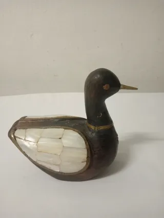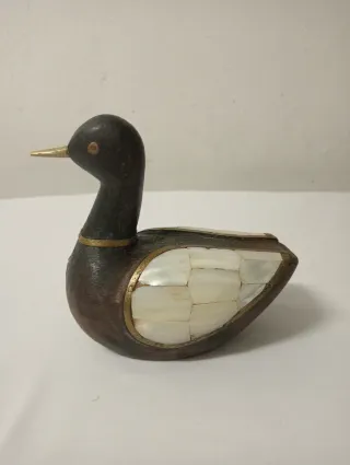 Graziosa papera decorativa vintage, realizzata in legno con inserti in madreperla e ottone. Lunga 15 cm, alta 13 cm, circonferenza 26 cm. - Dettagli in ottone sul collo e sul becco. - Becco in metallo dorato. - Occhi in resina. - Decorazione in madreperla sul dorso.
