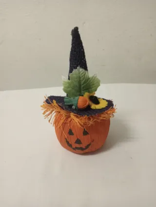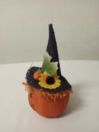 Deliziosa zucca decorativa a tema Halloween, perfetta per aggiungere un tocco festivo alla tua casa. Alta 15,5 cm, circonferenza 23 cm. - Realizzata in materiale intrecciato arancione. - Volto sorridente dipinto. - Cappello da strega nero decorato con foglie e fiore.