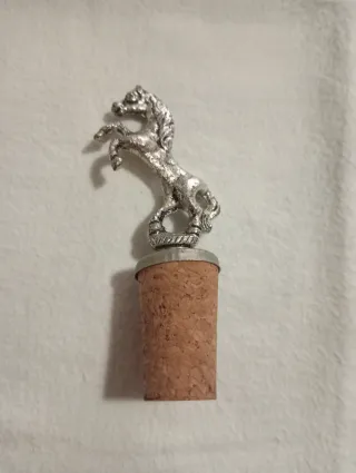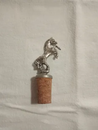 Un elegante tappo per bottiglie vintage con una decorazione a forma di cavallo rampante. Lungo 9 cm, largo 2 cm. - Materiale: metallo argentato e sughero. - Design: cavallo rampante dettagliato. - Stile: vintage.