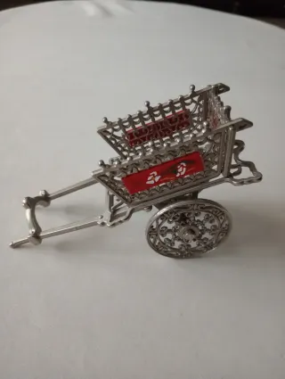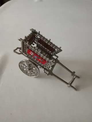 Delizioso carretto in miniatura, perfetto come soprammobile o oggetto decorativo. Lungo 14 cm, largo 5 cm, alto 8 cm. - Struttura in metallo argentato finemente lavorato. - Dettagli rossi con decorazioni dipinte. - Ruota decorata con motivi traforati.
