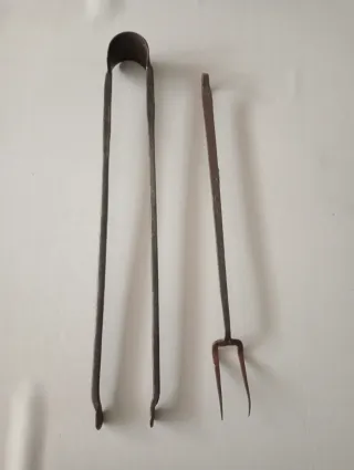 Set di due attrezzi vintage realizzati a mano - Pinza con estremità a cucchiaio. Lunga 46 cm, larga 6 cm. - Forchettone a due rebbi. Lungo 41 cm.