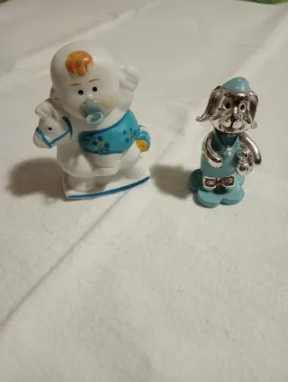 Delizioso set di due soprammobili in ceramica, perfetti per aggiungere un tocco di dolcezza alla tua casa. - Un bebè su un cavallo a dondolo con ciuccio e bavaglino azzurro. Alto 7,5 cm, lungo 5 cm, largo 3 cm. - Un cagnolino con cappello e grembiulino azzurro, che tiene un piccolo orsacchiotto. Alto 6,5 cm, lungo 3 cm.