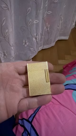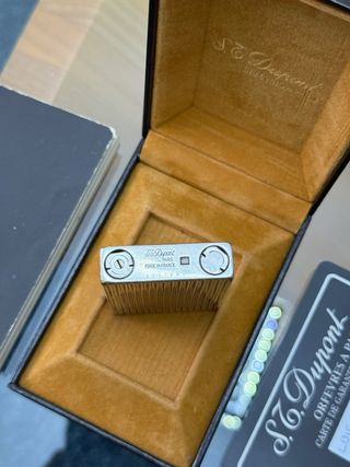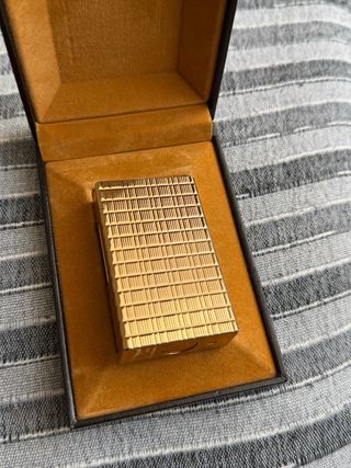 Elegante accendino Dupont in finitura oro. - Design classico e raffinato. - Superficie testurizzata per una presa sicura. - Dettaglio metallico sulla chiusura.