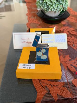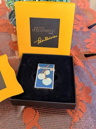 Elegante accendino Dupont con un design unico. - Modello Fiamme con decoro di ciliegie. - Colore blu e argento. - Scatola originale inclusa. - Certificato di garanzia datato 15-02-2001.