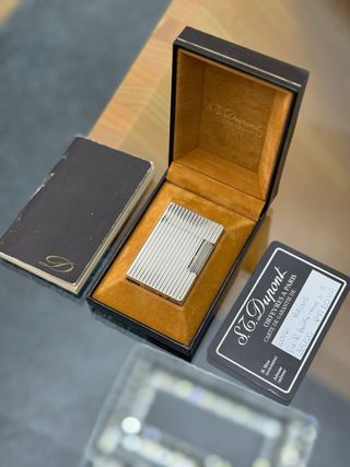 Elegante accendino S.T. Dupont, un pezzo vintage da collezione. - Design a righe sottili. - Finitura in metallo argentato. - Completo di scatola originale e certificato di garanzia.