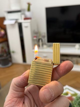 Elegante accendino Dupont in oro, con un design a righe. - Finitura lucida. - Coperchio apribile.