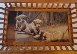 Vendo splendido vassoio rettangolare in legno dal fascino rustico, ideale sia per il servizio che come elemento decorativo da collezione. Struttura interamente realizzata in legno naturale con venature a vista sulla base posteriore. Bordi rialzati con una particolare lavorazione a listelli verticali (stile ringhiera) che conferisce leggerezza e un tocco artigianale al pezzo. Il fondo del vassoio presenta una dolcissima illustrazione in stile pittorico che ritrae tre cuccioli di Golden Retriever che interagiscono con un piccolo anatroccolo davanti a un vecchio fienile. Perfetto per servire la colazione, come svuota-tasche.