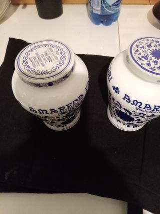 Vendo 2 vasetti di Amarena Fabbri. - Vaso in ceramica bianca con decorazioni blu. - Ideali per collezionismo o come contenitori decorativi.
