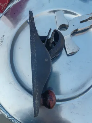 Pialla da legno vintage, per lavori di falegnameria. - Corpo in metallo scuro. - Manopola anteriore in legno scuro. - Lama in metallo.