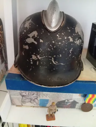Elmetto originale M34 della FeuerSchutzPolizei, risalente alla Seconda Guerra Mondiale. - Elmetto in metallo nero con finitura usurata. - Cresta metallica sulla parte superiore. - Bordatura metallica attorno alla base.