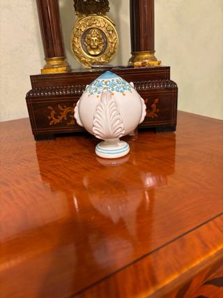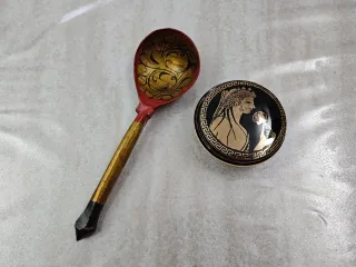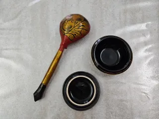 Set composto da un cucchiaio in legno Russo vintage realizzato a mano e decorato e una ciotola con coperchio in ceramica Greca con finiture in oro 24kt (vedi foto n°3) .