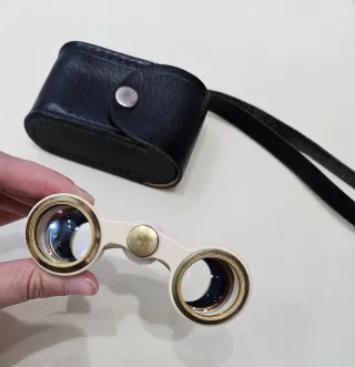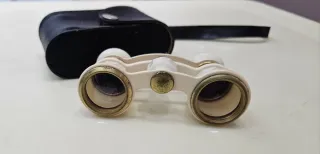 Binocolo vintage da teatro in bachelite e finiture in ottone risalente al 900, originale dell'URSS. Lenti svitavili e perfettamente integre, possibilità di regolare la distanza e custodia originalein cuoio. Segni del tempo visibili (vedi le foto). - Design classico. - Finiture dorate.