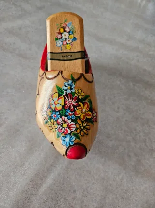 Zoccolo olandese in legno, decorato a mano con un motivo floreale vivace e spazzola. Un pezzo decorativo unico da appendere alla parete. Altezza zoccolo 6cm Altezza zoccolo con spazzola 8cm Lunghezza zoccolo 16 cm Larghezza zoccolo 7cm Lungazza spazzola 11cm Larget spazzola 4cm - Decorazione floreale dipinta. - Finitura in legno naturale.