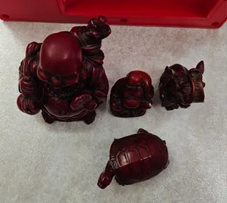 Set di statuette decorative in stile cinese, realizzate in resina rossa. Il piccolo Buddha e l'elefante presentano delle ammaccature (vedi foto). - Raffigurano un Buddha sorridente con ventaglio e sacca, un secondo Buddha seduto, un elefante e una tartaruga. - Dettagli curati e finitura lucida.