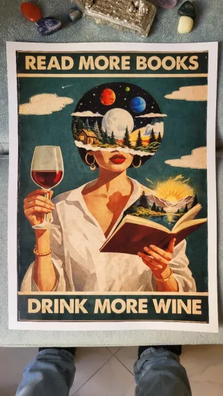 Poster Read More Books, Drink More Wine in formato A3. Stampa di alta qualità su carta tipografica da 250gr. - Dimensioni: A3. - Carta: Tipografica 250gr. - Condizioni: Come nuovo.