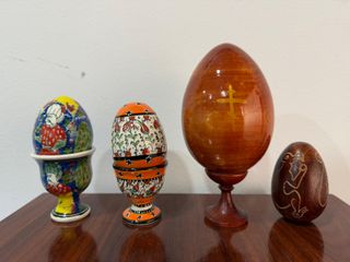 Lote di 4 uova decorative artigianali di diversi stili e materiali. Include 2 uova di ceramica smaltata dipinte a mano (una con scene figurative e l'altra con decorazione floreale tradizionale), 1 grande uovo di legno policromo con iconografia religiosa (Vergine con Bambino) con finitura dorata e base tornita, e 1 uovo di legno intagliato con motivi di uccelli. Buono stato generale, ideali per decorazione vintage, collezione di arte popolare o pezzi unici per vetrina. Si vendono insieme.