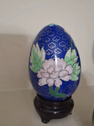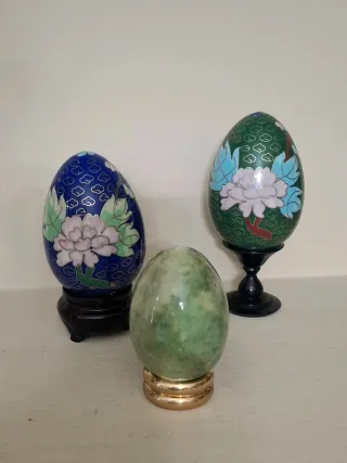 Set di tre uova decorative, perfette per aggiungere un tocco di stile alla tua casa. - Un uovo in pietra verde con base dorata. - Due uova in cloisonné con motivi floreali su sfondo blu e verde. Perfette condizioni