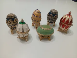 Set di sei uova decorative in stile Fabergé, perfette per collezionisti. - Uovo verde con dettagli dorati e cristalli. - Uovo blu scuro con decorazioni elaborate. - Uovo bianco con cristalli e dettagli dorati. - Uovo nero con motivi dorati e cristalli. - Uovo dorato con fasce blu e cristalli. - Uovo bicolore rosso e bianco con perle Con certificato numerato di autenticità e in confezione originale
