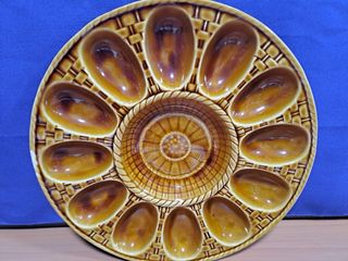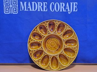 Piatto vintage in ceramica Vargas Gil con design per servire le uova. Siamo l'ONG Madre Coraggio. Tutti i profitti sono destinati a fini sociali. - Design a cesto. - Centro decorativo. - Colore marrone e ocra.
