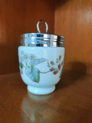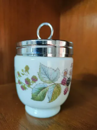 Elegante coddler vintage per uova con un design floreale di more e foglie. - Ceramica bianca. - Coperchio metallico con manico. - Decorazione dettagliata.