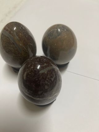 Set di tre uova decorative in pietra naturale, realizzate in agata lucidata. Dettagli: Materiale: Agata naturale. Finitura: Lucidata. Design: Forma di uovo. Quantità: 3 unità.