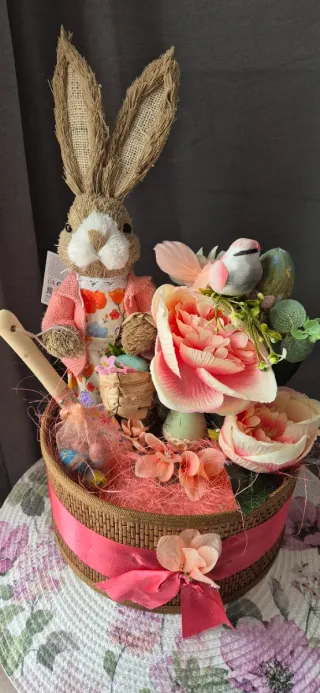 Graziosa decorazione a tema Pasqua, perfetta per aggiungere un tocco festivo alla tua casa. Il cesto è adornato con un coniglio, fiori artificiali e uova decorative. - Coniglio in paglia con vestiti. - Cesto in vimini con nastro rosa. - Fiori artificiali rosa e bianchi. - Uova decorative colorate.