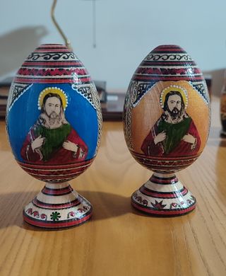 Uovo originale russo, tipico dell'iconografia sacra ortodossa, realizzato artigianalmente in legno e dipinto a mano, altezza 13,5cm. Da collezione. È rimasto solo l'uovo sulla sinistra nelle foto.