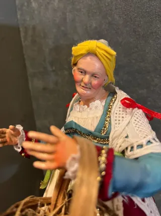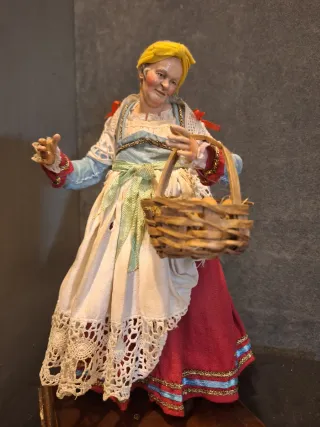 Deliziosa statuetta artigianale 25 cm raffigurante una venditrice di uova. Un pezzo unico per collezionisti. - Dettagli curati e colorati. - Realizzata a mano con materiali di qualità mani e piedi in legno occhi in vetro - Perfetta per arricchire presepi o diorami.