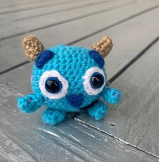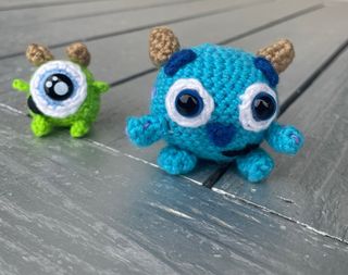 Set di due simpatici personaggi amigurumi ispirati a Monsters & Co.. Realizzati all'uncinetto con filato di alta qualità. - Personaggio verde con un occhio solo (Mike Wazowski). Altezza comprese corna 3 cm. - Personaggio blu con due occhi e corna (James Sullivan). Altezza comprese corna 5 cm. - Dettagli colorati e occhi grandi e luminosi.