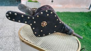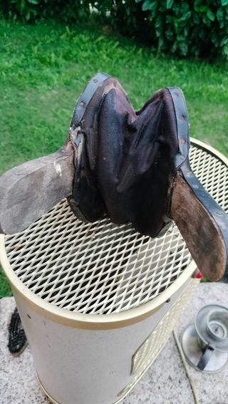 Soffietto per camino in stile antico, - Rivestimento in scamosciato nero. - Dettagli con borchie metalliche. - In pelle e legno È funzionante e non presenta lacerazioni, il meccanismo di soffiatura funziona, ma si vende per ovvie ragioni come oggetto da collezione.