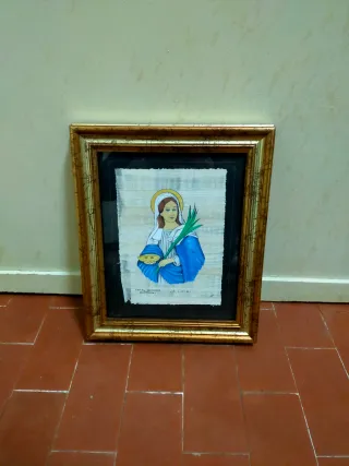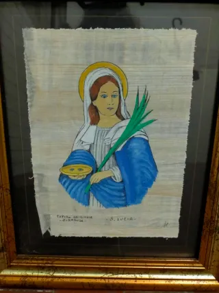 Dipinto su papiro originale di Siracusa raffigurante Santa Lucia. Con cornice antica e certificato di autenticità. Dimensioni cornice 25.5 x30.5 cm - Opera d'arte unica. - Incorniciato con cornice dorata.