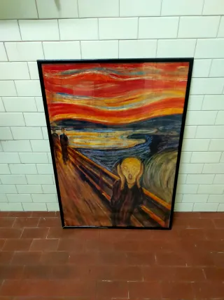 Riproduzione del celebre dipinto L'Urlo di Edvard Munch. Un'icona dell'arte moderna. Dimensioni 90x61 Si vende solo la stampa, cornice rotta