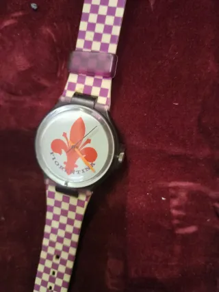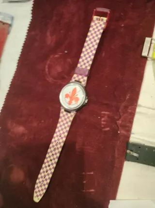 Orologio da polso con cinturino a scacchi viola e bianco. Il quadrante presenta il simbolo del giglio di Firenze e la scritta FIORENTINA. - Design a scacchi viola e bianco sul cinturino. - Simbolo del giglio di Firenze sul quadrante. - Scritta FIORENTINA sul quadrante. NON TESTATO