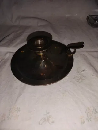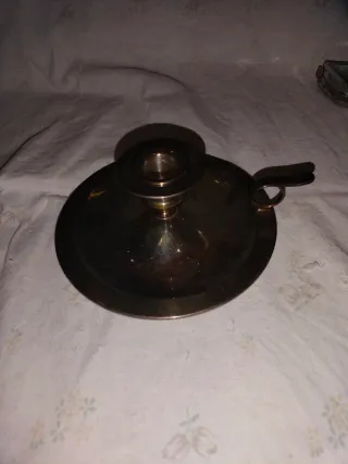 Elegante portacandele dal design antico, con finitura simile all'argento. - Base rotonda e larga. - Manico laterale per un facile trasporto. - Supporto per candela centrale.