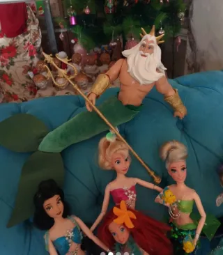 Lotto composto da Ariel, Re Tritone e tre sorelle. - Personaggi ispirati al mondo Disney. - Re Tritone con tridente e coda da tritone. - Le sorelle hanno code da sirena.