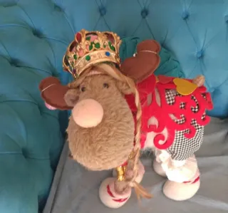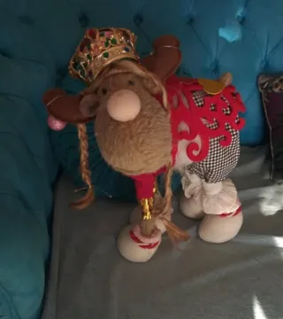 Renna decorativa realizzata a mano con abiti unici. - Corona dorata con dettagli colorati. - Abito rosso con decorazioni elaborate. - Tessuto a scacchi e dettagli in pizzo bianco sulle gambe.